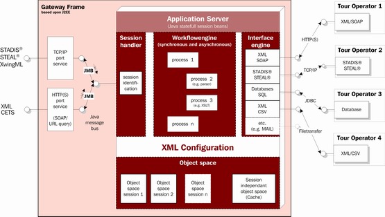 Das dynamische Gateway Frame mit Logik. Mit einer neu entwickelten Technologie ermöglicht das Gateway Frame die Verbindung von Systemen mit unterschiedlichen Schnittstellendefinitionen. Bei dem dynamischen Gateway Frame handelt es sich um Grundfunktionalitäten, mit denen schnell ein individuelles Gateway mittels Konfiguration implementiert werden kann. Es besteht aus einer konfigurierbaren Interface- und Workflow-Engine zur Bedienung von Schnittstellen und Steuerung von Abläufen. Auf der technischen Grundlage des dynamischen Gateway Frames wurden als Produkte bisher DynaPack und DynaGate entwickelt. Mit DynaPack lassen sich Leistungen unterschiedlicher Anbieter kombinieren und online in einem Gesamtreisepaket buchen. DynaGate ermöglicht z.B. den Einsatz der neuen STEAL®-Technologie oder XwingML für die Nutzung dynamischer Teilmasken in den CRS-Systemen ohne Anpassung an bereits bestehenden Gateways.