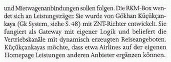 ... Bei GK System/ZNT Richter will IT-Spezialist Gökhan Kücükcankaya den Kunden, die über keine eigene Flug-Engine verfügen, künftig das Dynamic Packaging Tool inklusive einer Linienflug-Buchungsmaschine anbieten. Mitte August soll als Linien-Engine die IBE von Ires.net angebunden werden, kündigt Kücükcankaya an: "Die notwendige XML Schnittstelle haben wir gemeinsam definiert." Sobald Ires.net eingebunden sei, werde Hinundweg.de die Dynamic-Packaging-Lösung von GK System einsetzen. Dann sollen folgende touristische Leistungen mit dieser Technologie gebündelt werden: Linienflug, Charterflug, Warmwasser-Hotels und Mietwagen. Die Hoteldatenbank mit rund 3500 Hotels in Warmwasser-Gebieten ist eine Eigenentwicklung von Hinundweg. ...